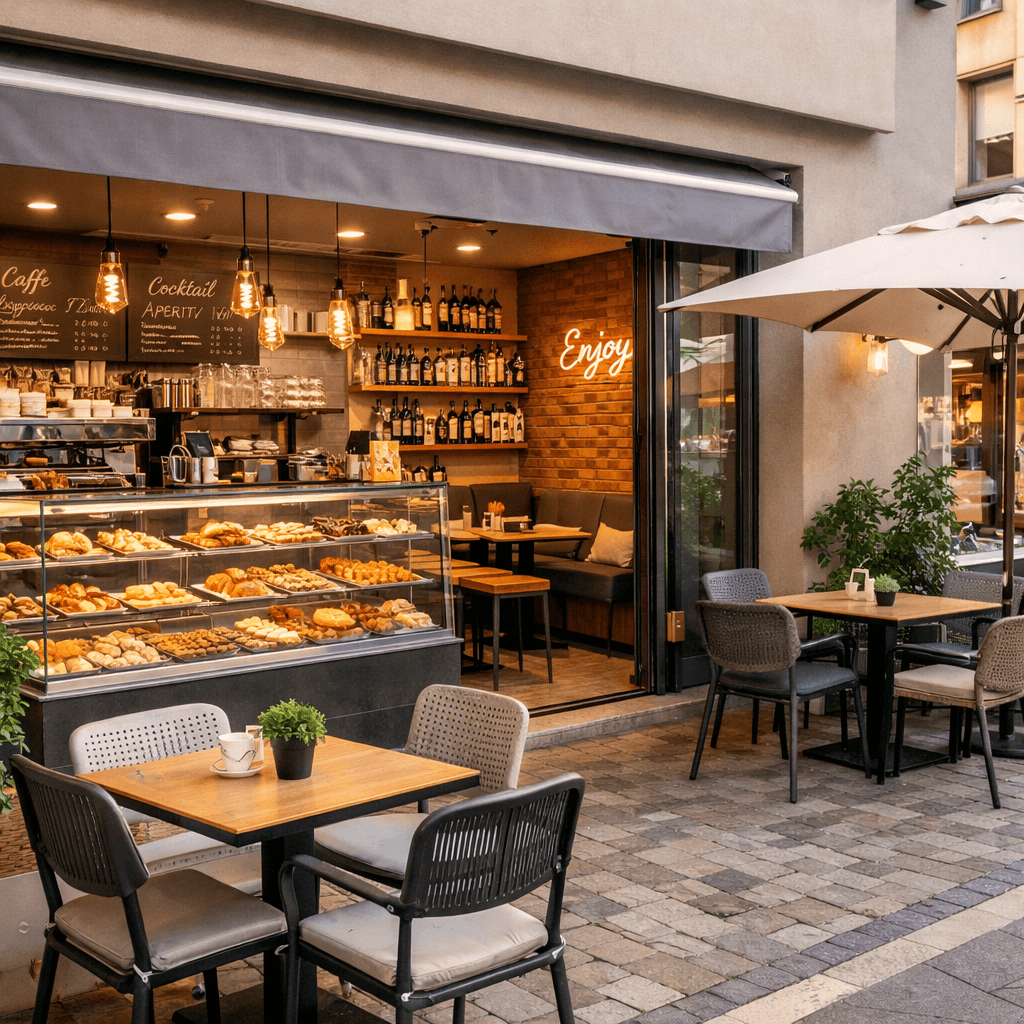 Quando il tempo lo permette, la parte esterna diventa un piccolo punto di ritrovo, perfetto per chi vuole godersi un caffè all’aria aperta.